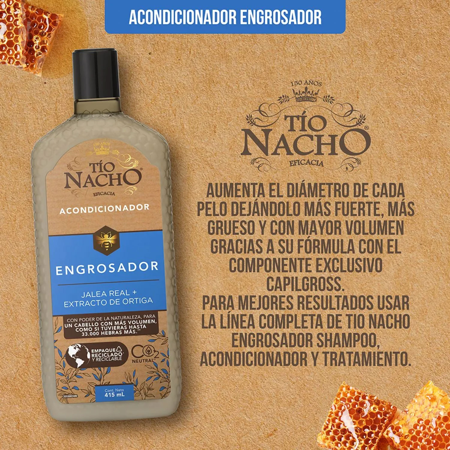 Luego de aplicar el Shampoo Tío Nacho Engrosador, aplicar el Acondicionador de medios a puntas sobre el pelo mojado y enjuaga con abundante agua.