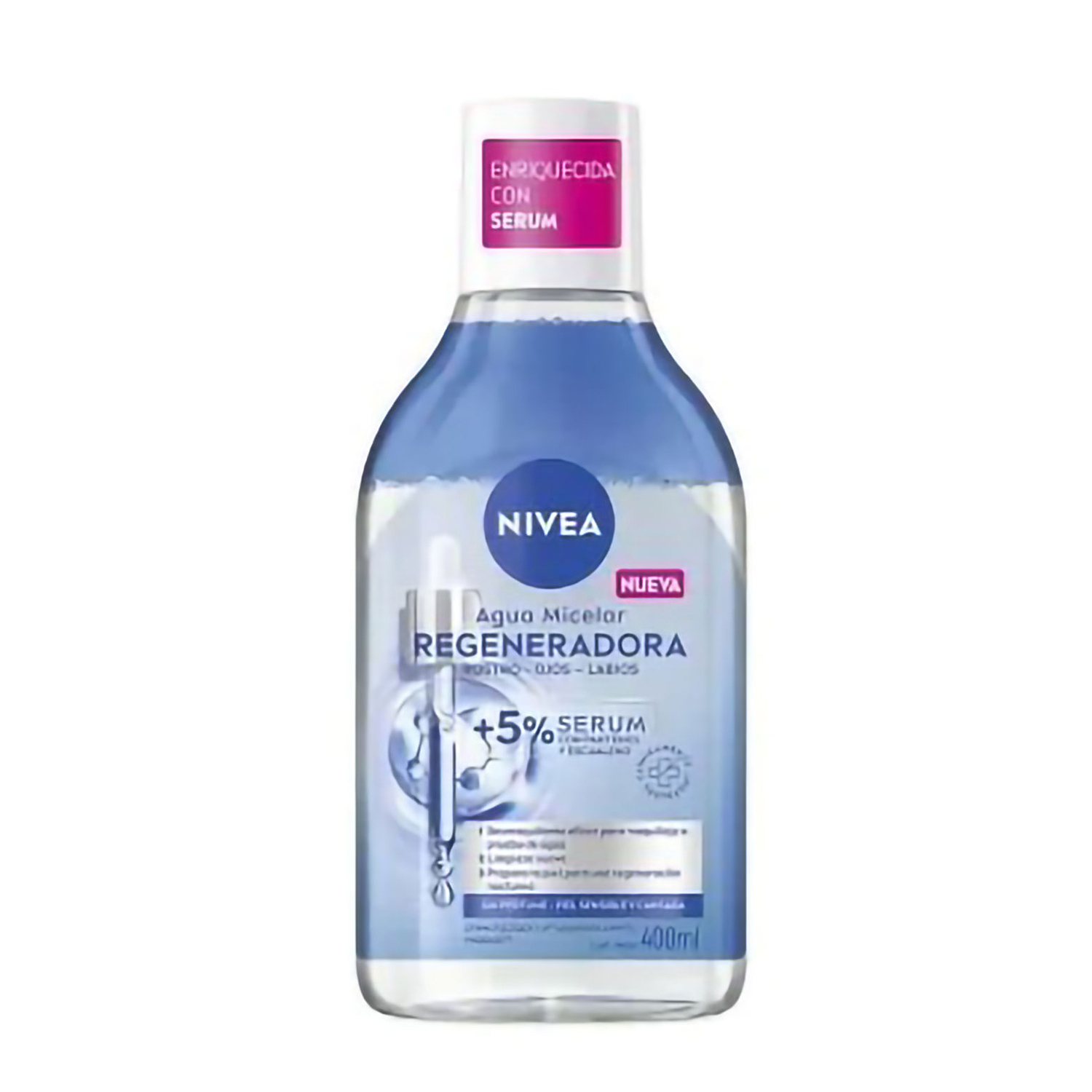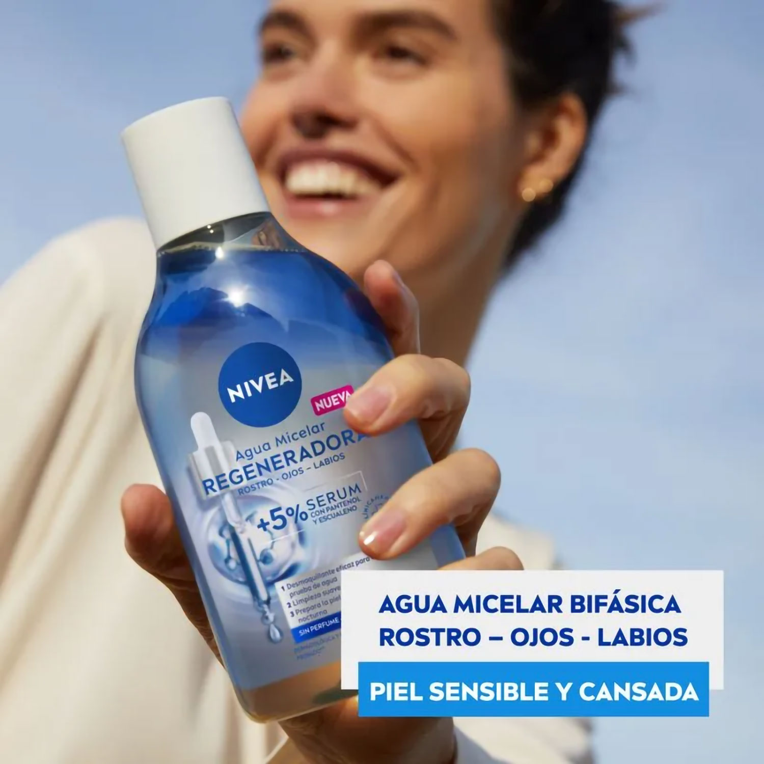 2) Aplicar NIVEA Agua Micelar Regeneradora suavemente por tu cara y ojos cerrados para disolver el maquillaje
