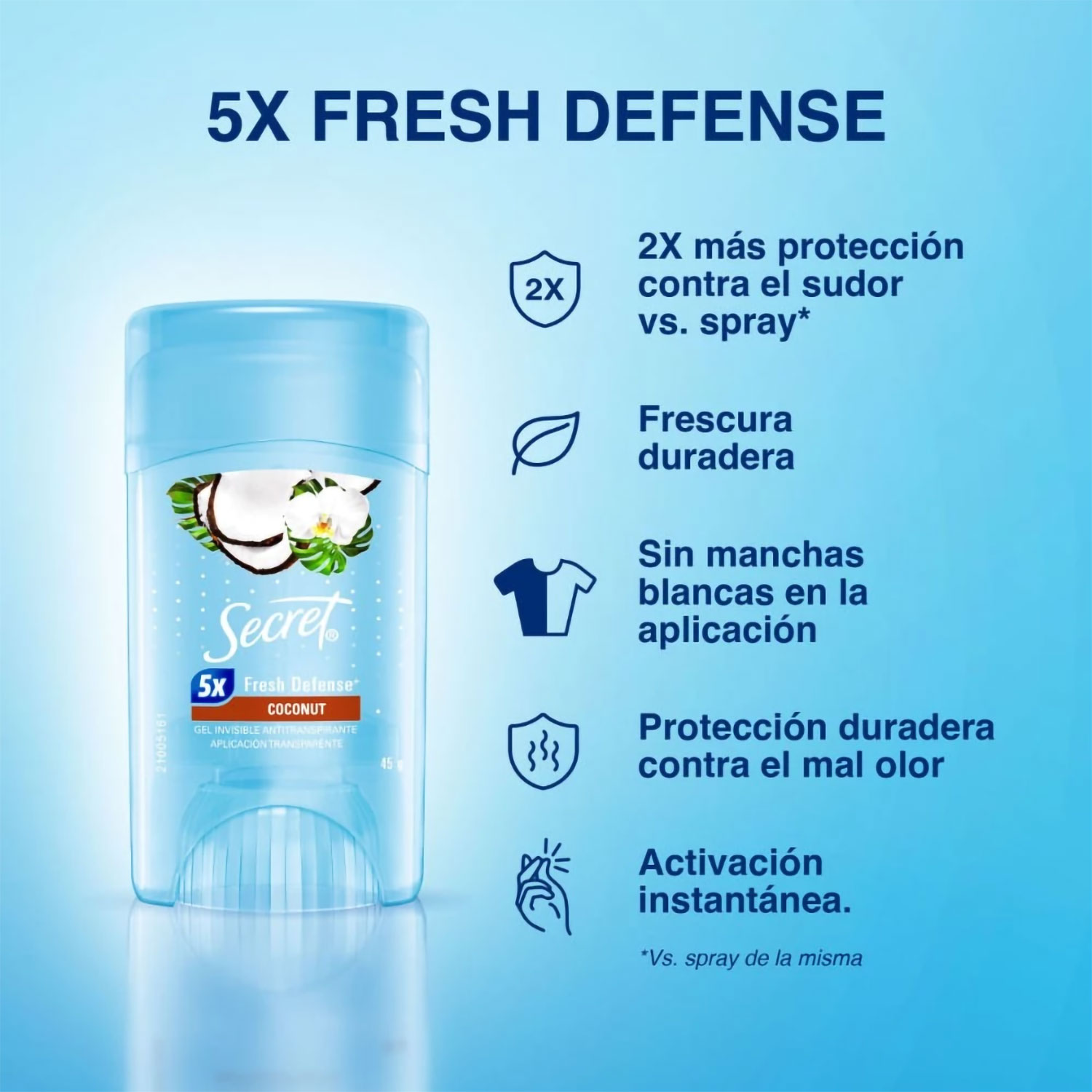 Su TECNOLOGÍA 5X FRESH DEFENSE te ofrece los siguientes beneficios: 1) 2X más protección contra el sudor vs. spray,* 2) Frescura Duradera, 3) Sin manchas blancas en la aplicación, 4) Protección Duradera contra el mal olor, 5) Activación Instantánea.