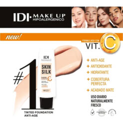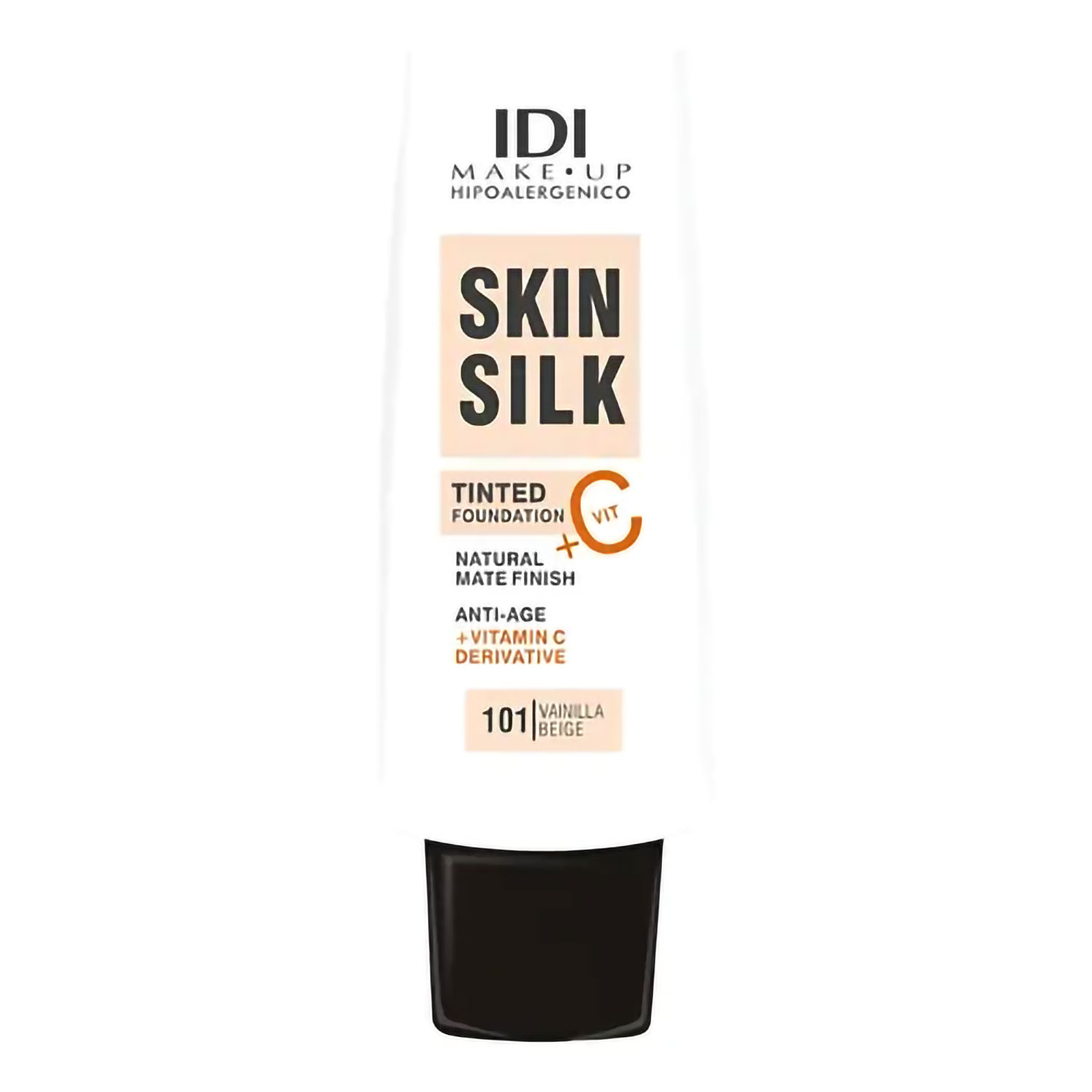 Base líquida IDI Make Up Skin Silk con Vitamina C en tono 101 Vainilla Beige. Su fórmula antioxidante aporta luminosidad e hidratación, ayudando a prevenir los signos del envejecimiento.