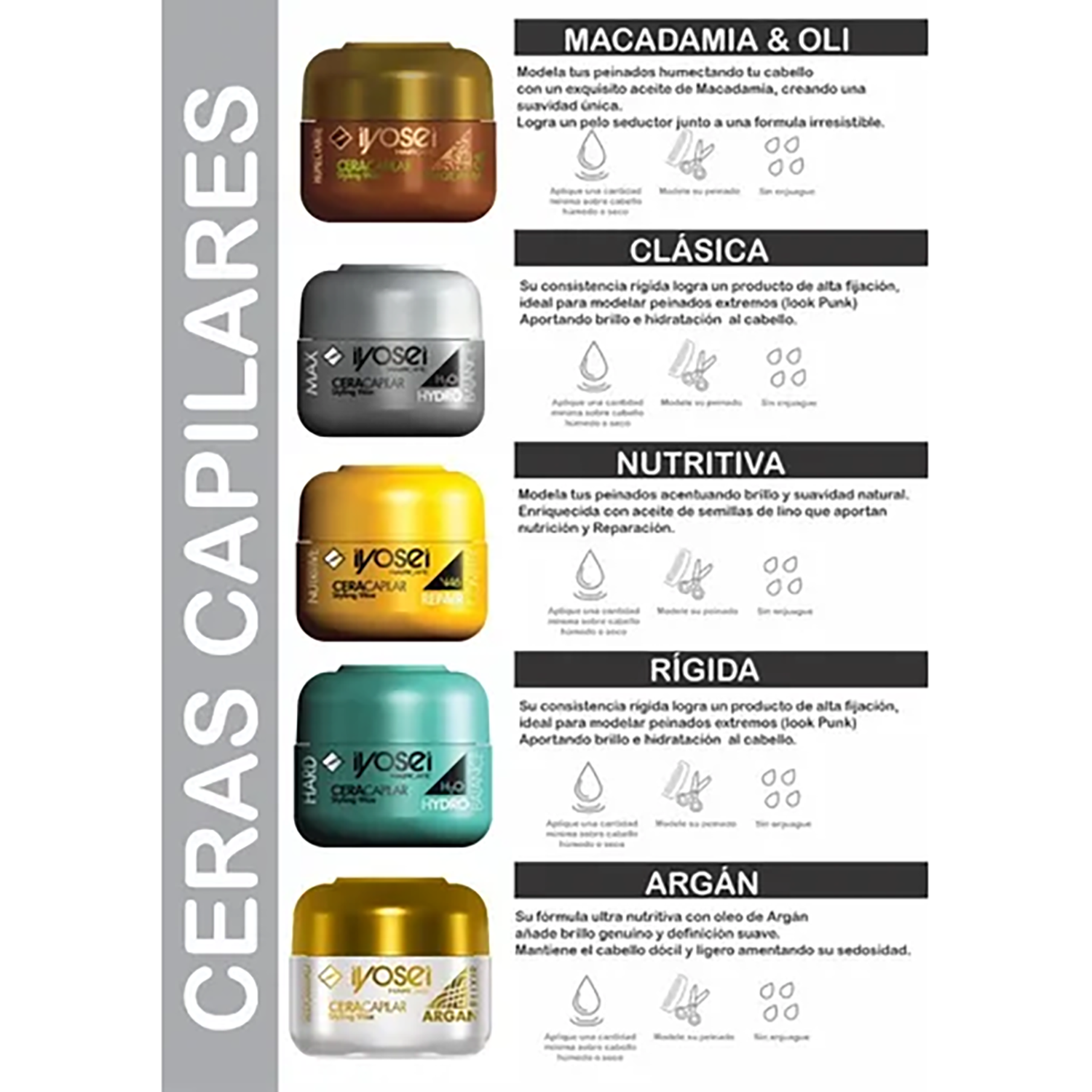 Cera capilar de consistencia rígida ideal para modelar peinados extremos (look punk), aportando brillo e hidratación al cabello.