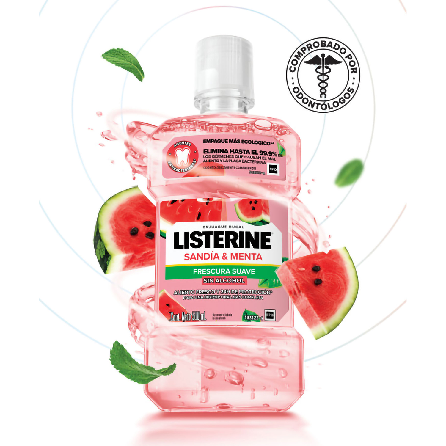 Agrega el enjuague bucal sin alcohol LISTERINE® Sandía y Menta, 500 ml, a tu rutina y limpia donde tu cepillo de dientes no llega, eliminando hasta el 99% de los gérmenes* que causan mal aliento, placa y gingivitis. Agrega LISTERINE® y limpia hasta el 100% de tu boca.