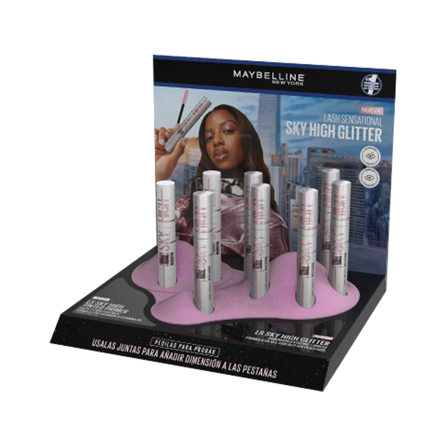 Su innovador cepillo cónico flexible alcanza cada una de tus pestañas sin dejar grumos. Conseguí unas #PESTAÑASCONALTURA con un acabado con Glitter plateado.
