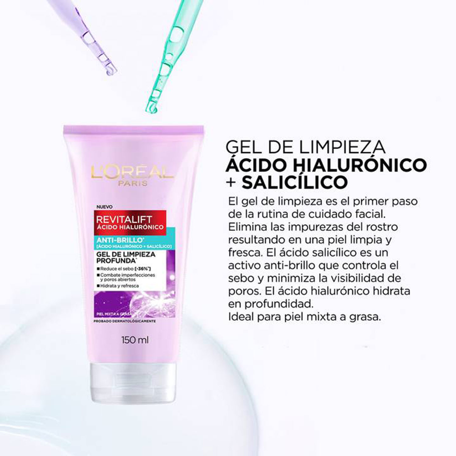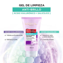 El Gel de Limpieza Revitalift Anti Brillo constituye el primer y fundamental paso en la rutina de cuidado facial. Elimina las impurezas del rostro sin resecar, resultando en una piel limpia e hidratada. Además, gracias a su contenido de ácido salicílico mantiene la piel sin briilo y disminuye la visibilidad de los poros.