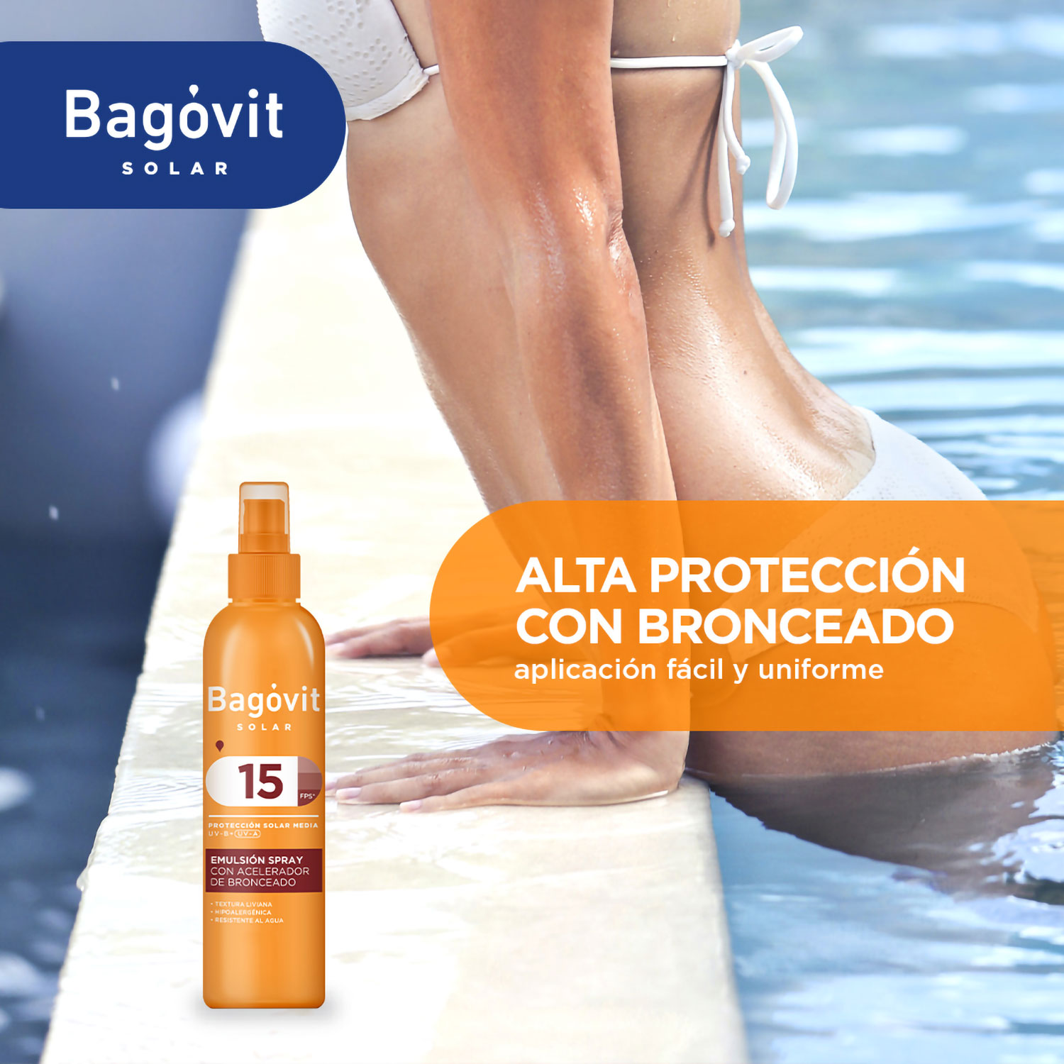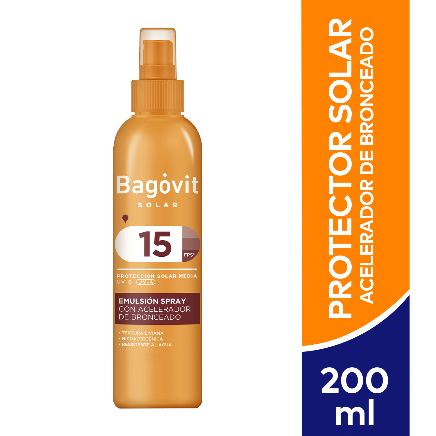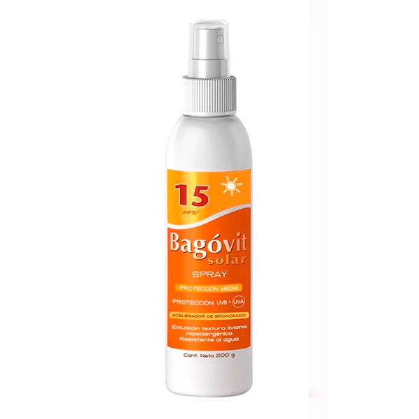 Bagóvit Solar Emulsión Spray FPS 15 con Acelerador de Bronceado, de textura liviana, fácil aplicación, rápida absorción y con excelentes propiedades humectantes. Sus 4 filtros solares UVA + UVB protegen la piel permitiendo el bronceado. La comprobada fotoestabilidad y la resistencia al agua de este producto aseguran una adecuada protección contra las radiaciones solares nocivas, evitando además el fotoenvejecimiento prematuro. Contiene vitamina E y aloe vera. Ayuda a prevenir las quemaduras solares. Todo tipo de piel.