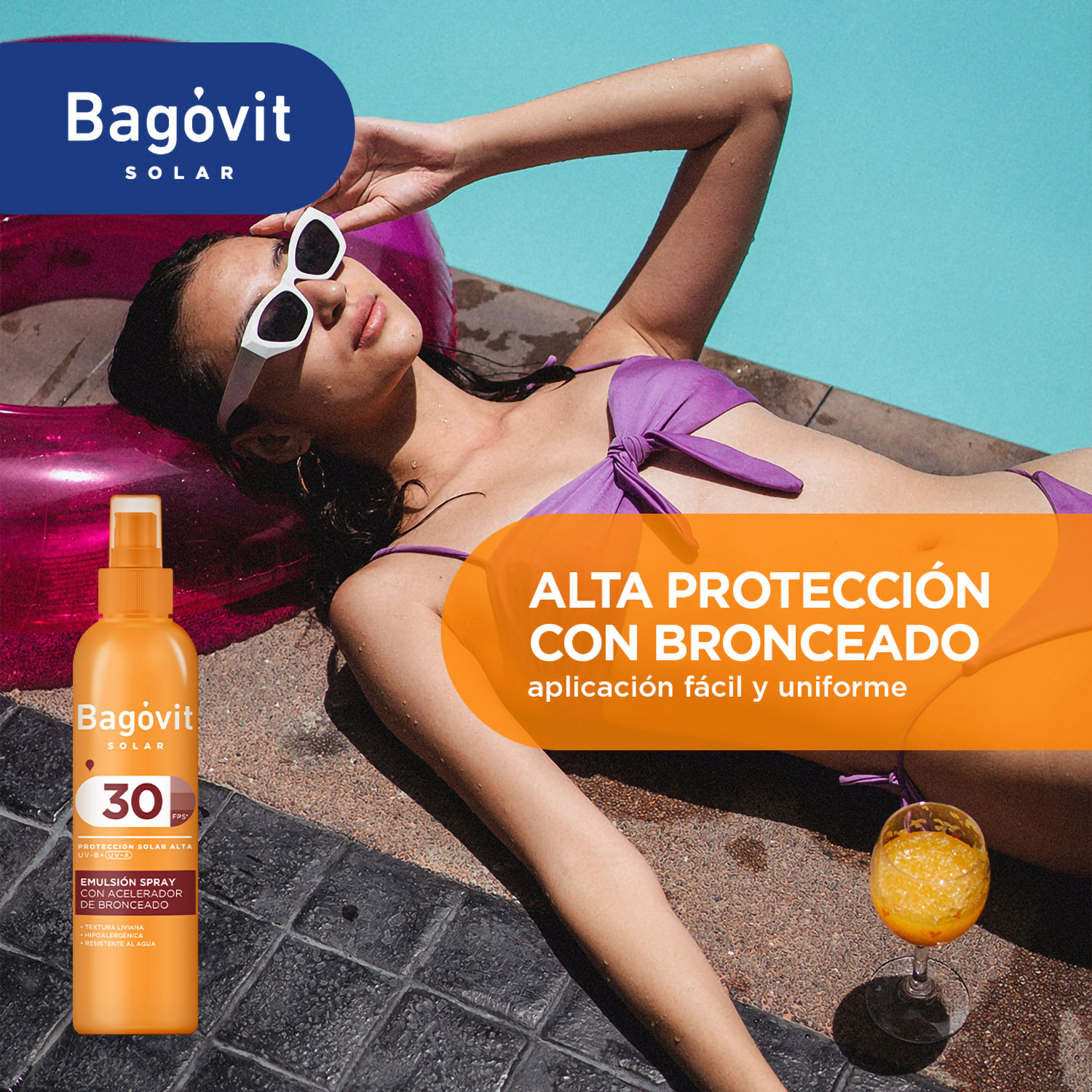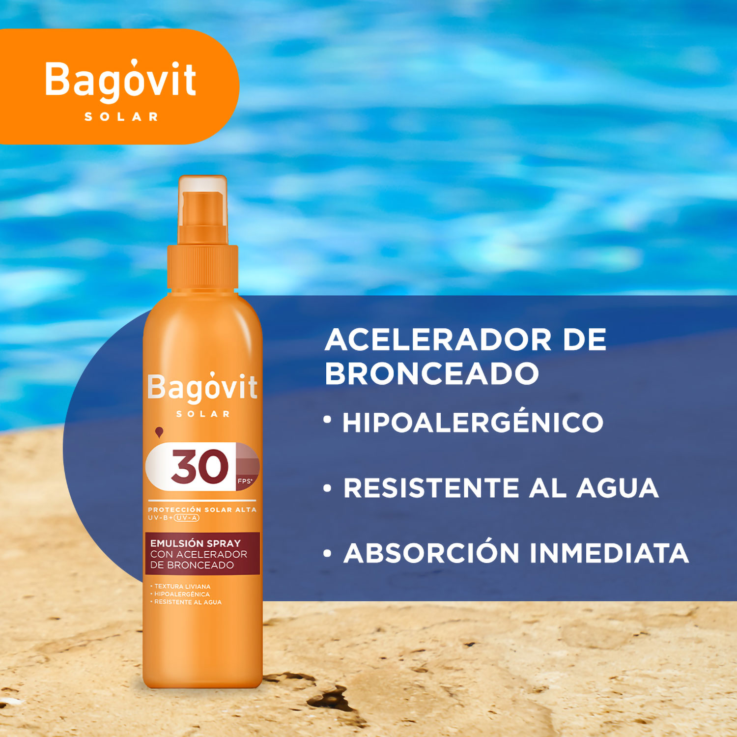Bagóvit Emulsión Spray FPS 30 con Acelerador de Bronceado, de textura ultra liviana, fácil aplicación, rápida absorción y con excelentes propiedades humectantes. Sus 3 filtros solares UVA + UVB especialmente seleccionados protegen la piel permitiendo el bronceado. La comprobada fotoestabilidad y la resistencia al agua de este producto aseguran una adecuada protección contra las radiaciones solares nocivas, evitando además el fotoenvejecimiento prematuro. Contiene vitamina E y aloe vera. Ayuda a prevenir las quemaduras solares. Todo tipo de piel.