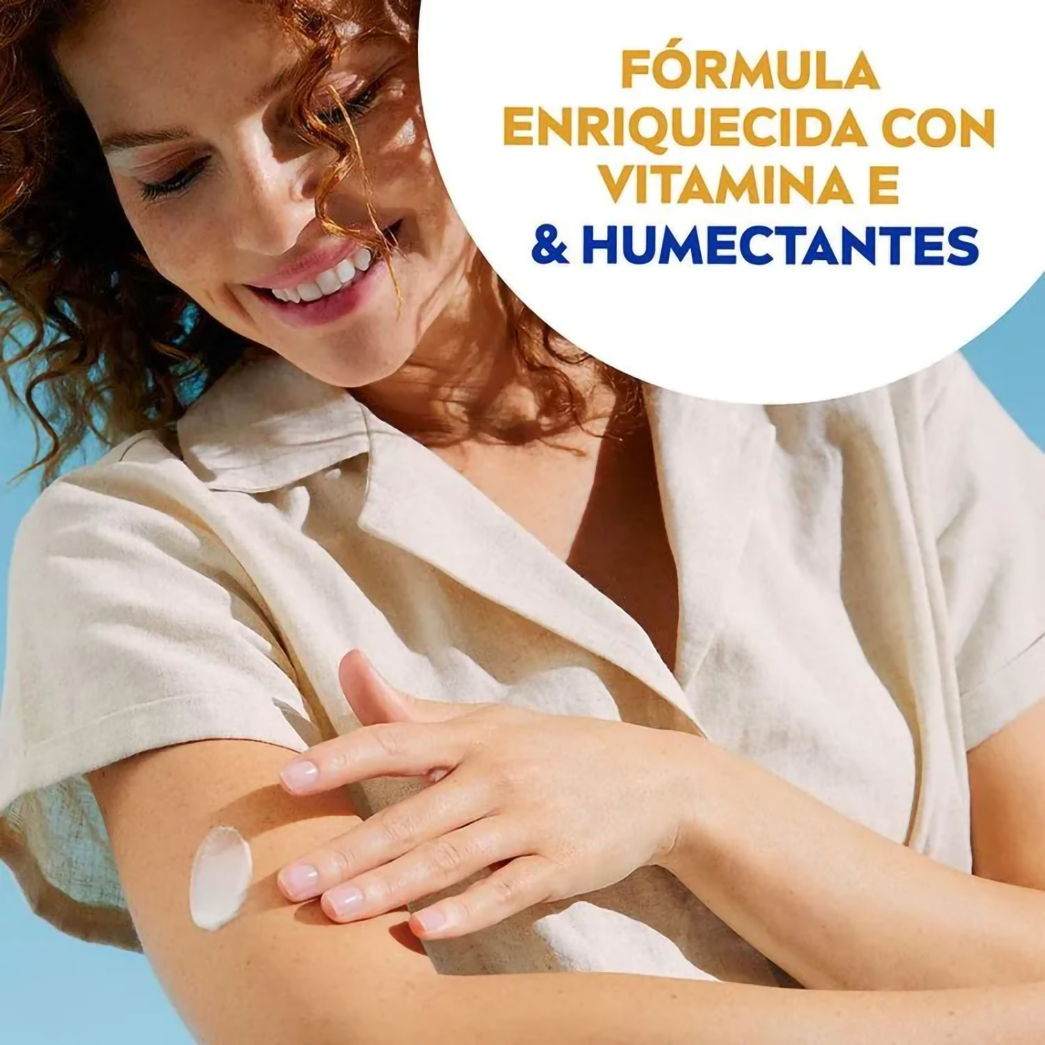 Está enriquecido con Vitamina E, un potente antioxidante con propiedades antiinflamatorias que ayudan a calmar y suavizar la piel, reduciendo el enrojecimiento y la irritación causadas por la exposición solar. Contiene FPS 50+ (abarca hasta un FPS 65), es resistente al agua y está dermatológicamente probado