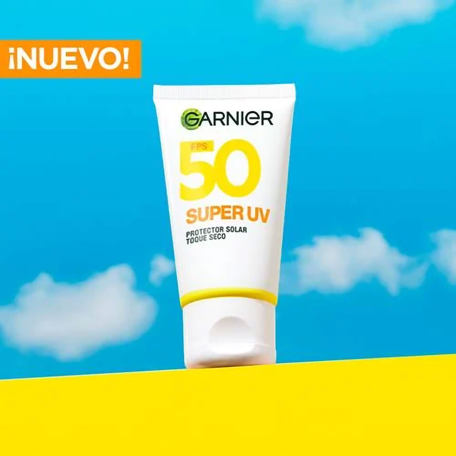 Garnier Super UV Toque Seco obtén una protección solar facial diaria. Antimanchas con textura ligera y efecto mate, FPS 50 y Vitamina C.