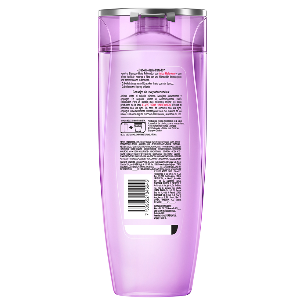 ¿Cabello deshidratado? El shampoo Hidra rellenador, con ácido Hialurónico y con efecto Anti-sal, recarga la fibra con una hidratación intensa para una transformación instanténea. • Cabello intensamente hidratado y limpio por más tiempo.