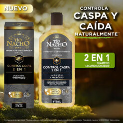 Anti-caida: Reduce la caída del cabello desde las primeras semanas. Su fórmula 2 en 1 no solo remueve la caspa, también refuerza cada hebra al acondicionar, ayudando a prevenir el quiebre y dejando el pelo más fuerte y nutrido. Su fórmula natural, combina limpieza y acondicionamiento en un solo paso. Enriquecida con extractos naturales como propóleo y jalea real, brinda un cuidado efectivo y más suave para el cabello y el cuero cabelludo. Propóleo + Jalea Real: la combinación natural distintiva de Tío Nacho. El propóleo ayuda a purificar el cuero cabelludo, controlando el exceso de grasa, mientras que la jalea real nutre profundamente. Juntos, crean una base saludable que ayuda a remover la caspa desde la raíz.