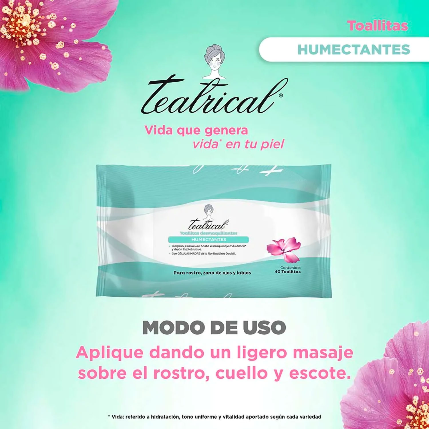 Las Toallitas Humectantes Teatrical con 40 piezas son ideales para limpiar, refrescar e hidratar tu piel en cualquier momento del día.