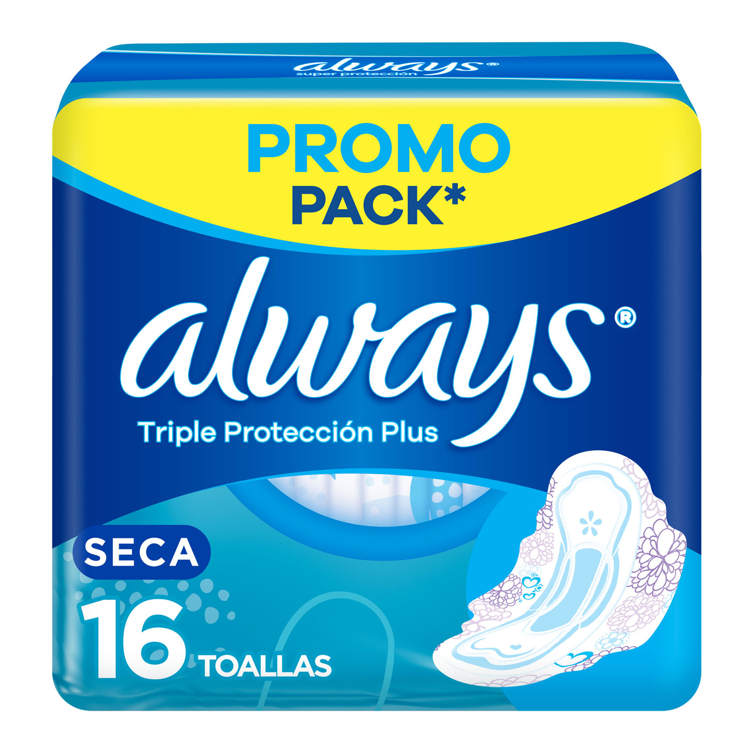 Protegete con las nuevas toallas femeninas Always Triple Protección Seca, las únicas por su sistema que protege 3X: Son las toallas más suaves de Argentina*; tienen Canales UltraFlex que se adaptan a tu cuerpo, distribuyen y retienen mejor el flujo para que te sintás súper cómoda, aún en movimiento, y contá con Tecnología SkinProtect que previene irritaciones de la piel íntima. Su cubierta de malla absorbe el flujo instantáneamente.